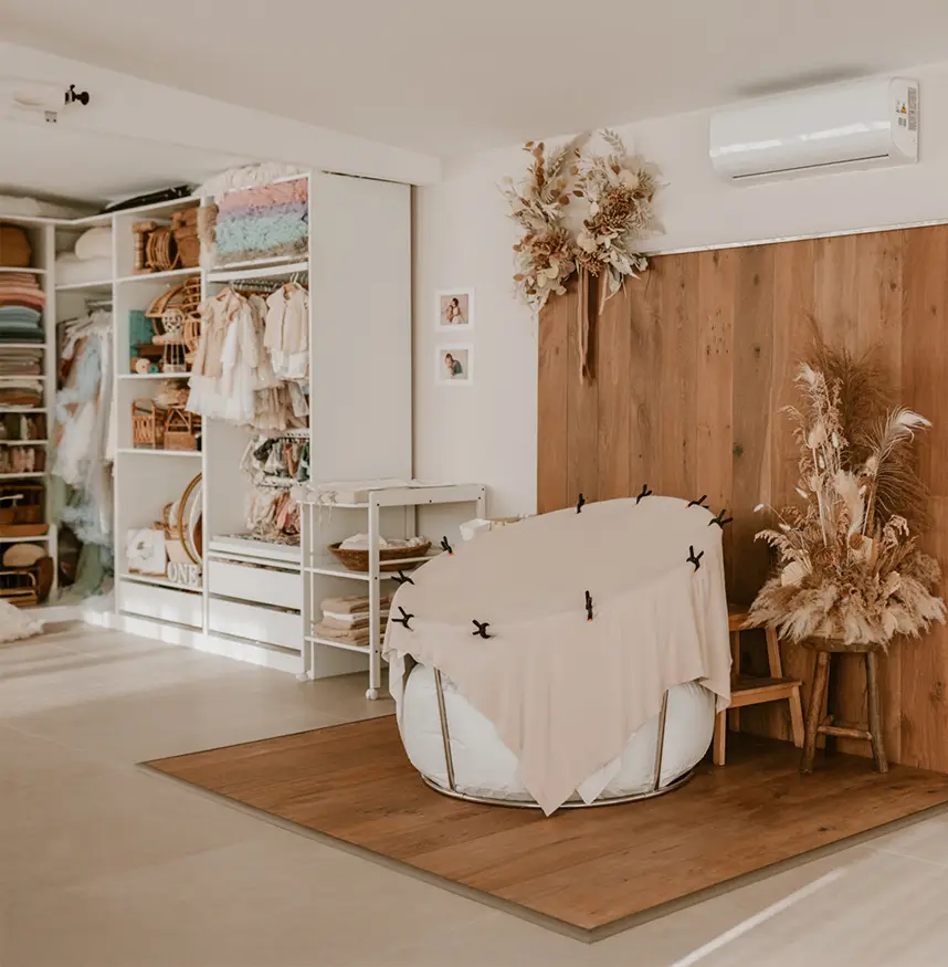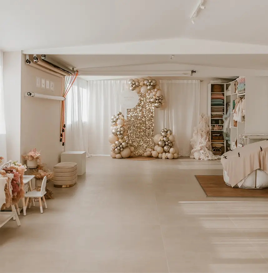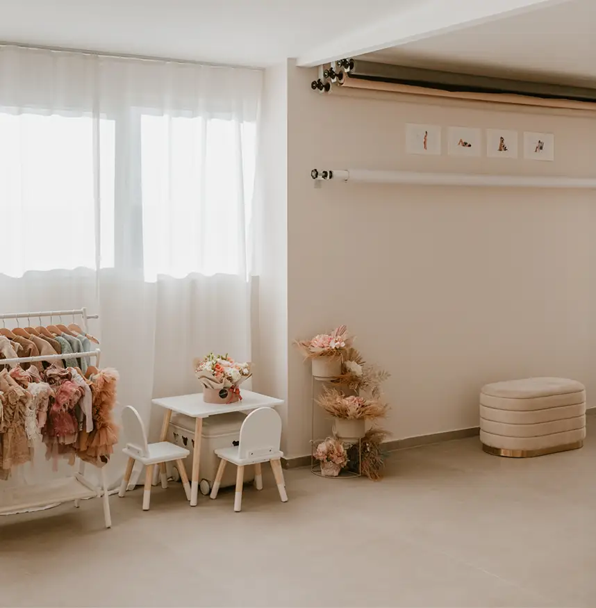 Studio je prostran, ispunjen prirodnom i mekom svjetlošću koja stvara toplu i nježnu atmosferu na fotografijama. Zidovi su u neutralnim tonovima, a minimalistički, ali elegantni detalji omogućuju da emocije i povezanost vaše obitelji budu u prvom planu.